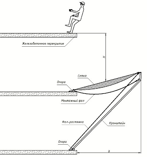 В зависимости от высоты падения рассчитывается показатель необходимой ширины безопасной зоны защитной сетки (см. таблицу и схему ниже).