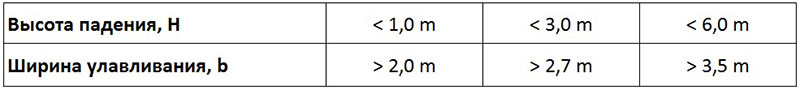 Табл. Допустимые значения высоты падения и соответствующие значения ширины защитной сетки